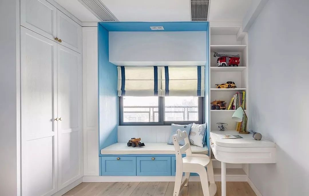▲ 男孩房,将原来的落地推拉门改造为飘窗,既能作为休闲空间,又能增加储物功能,清爽蓝色的融入,让人眼前一亮,充满轻松活力