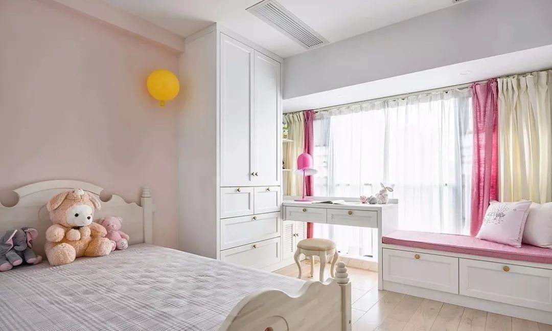 ▲ 女孩房的设计更加关注成长与学习,因此保留储物和写字台功能,软装上搭配小主人喜爱的粉色系
