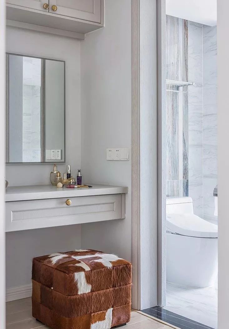 ▲ 利用角落空间设计小型梳妆台,线条感十足的柜子配上古铜色把手,与仿动物皮毛的矮凳呼应,打造轻奢质感