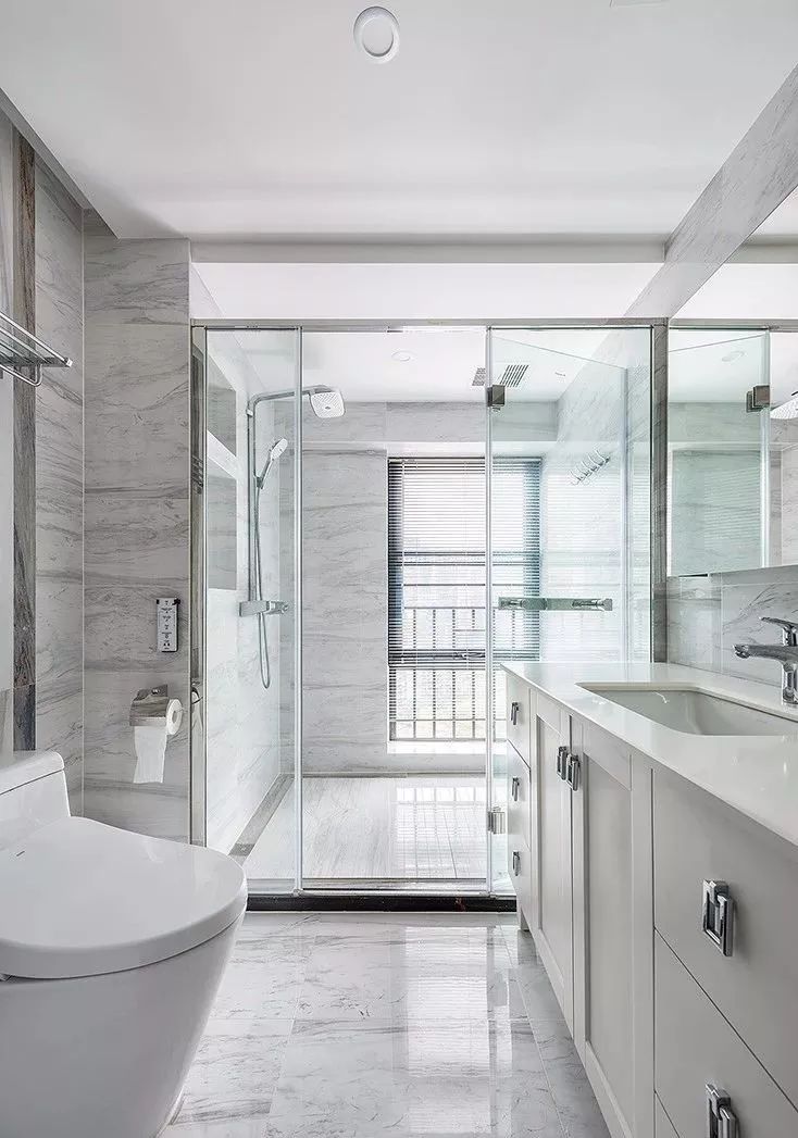 ▲ 主卫整体通铺青灰色石纹瓷砖,淋浴玻璃隔断