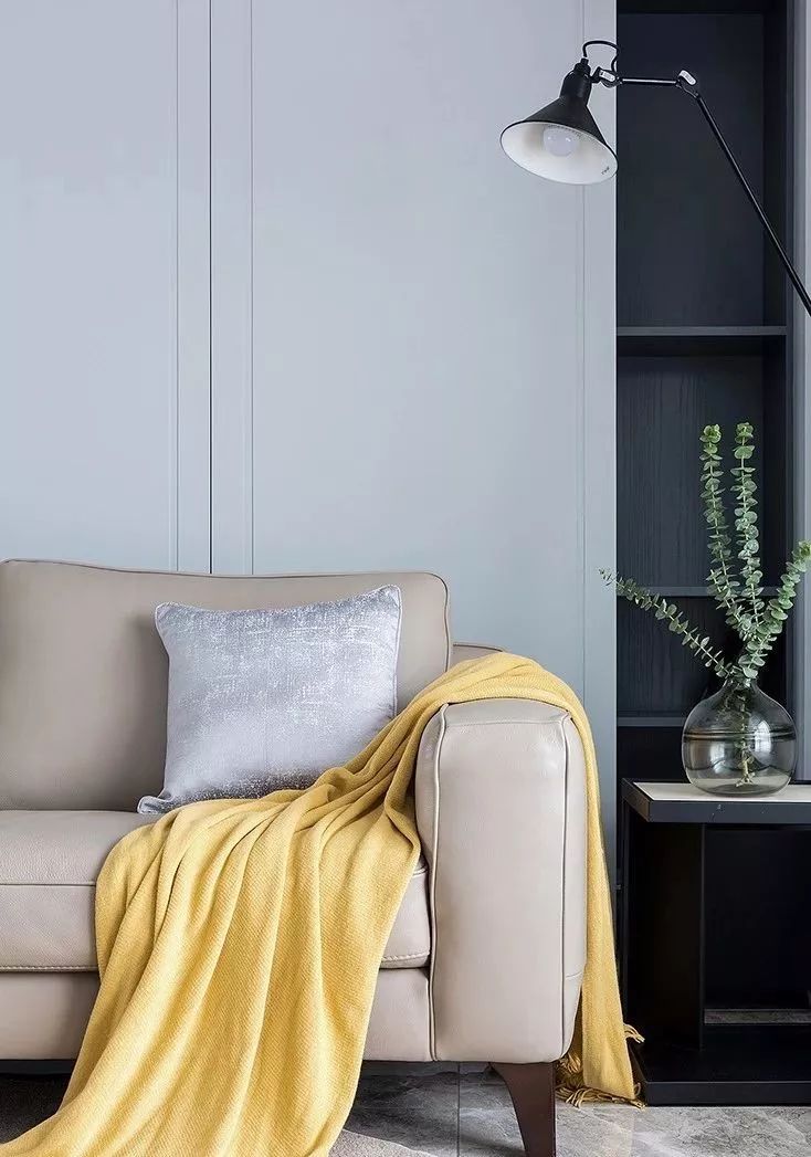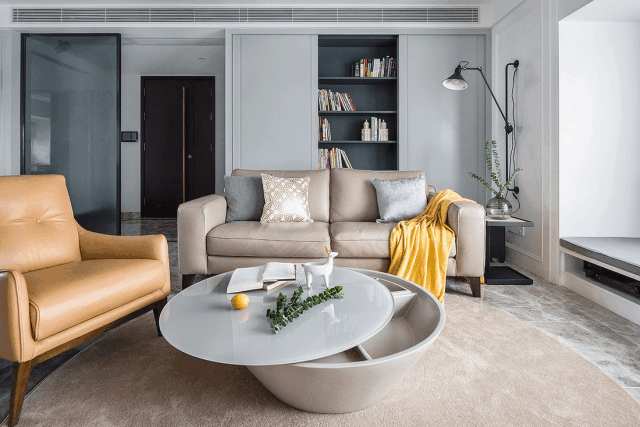 ▲ 客厅,整体以高级灰为基调,柔和的米咖色软装点缀,让温暖在简约的空间中蔓延