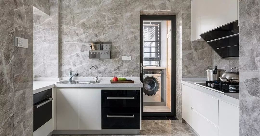 ▲ 厨房墙地通铺灰色大理石瓷砖,搭配现代风的橱柜,简洁大气