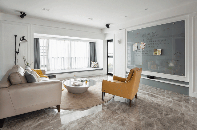 ▲ 把传统的电视背景墙设计为黑板墙,让孩子发挥创造力,用时尚又不占地的投影幕布取代电视,打造家庭影院