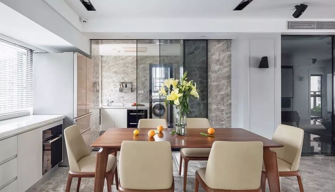 ▲ 餐厅一侧的窗边规划出西厨区,与厨房以玻璃推拉门为隔